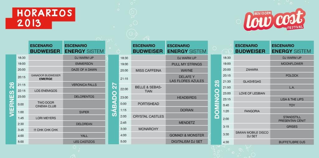 Hoy es día de horarios. Tras enseñaros los horarios del FIB, ahora le toca al Low Cost. Estos sí, cien por cien oficiales, ya que nos lo han dado a conocer desde el propio Twitter oficial del festival. Lo mejor es que, quitando unas pocas excepciones, podremos disfrutar de todos los conciertos ya que ninguno se pisa. ¡Chapeau!