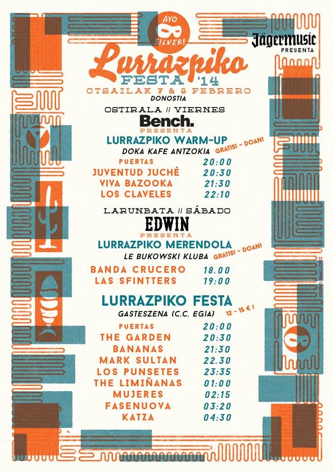 Estamos cansados de repetiros por activa y por pasiva lo grande que va a ser este fin de semana el Lurrazpiko Festa que nos tienen preparada la gente de Ayo Silver! A lo largo de este próximo viernes 7 y sábado 8 desfilaran por varios escenarios donostiarras grupos de esos que no ves todos los días y cuando llega su directo lo vives a muerte. Es el caso de los punkarras The Garden, el rock garagero bestial de Mujeres, la elegancia yeyé de The Limiñanas o el último concierto de Bananas. Todo ello concentrado en 48 horas muy intensas que servirán para combatir el mal tiempo del norte. Os dejamos con los horarios completos, recordándoos que esto echa a andar mañana a las 20.30 con el triplete gratuito de Juventud Juché, Viva Bazooka y Los Claveles. Las entradas anticipadas para el sábado las podéis comprar en el enlace.
