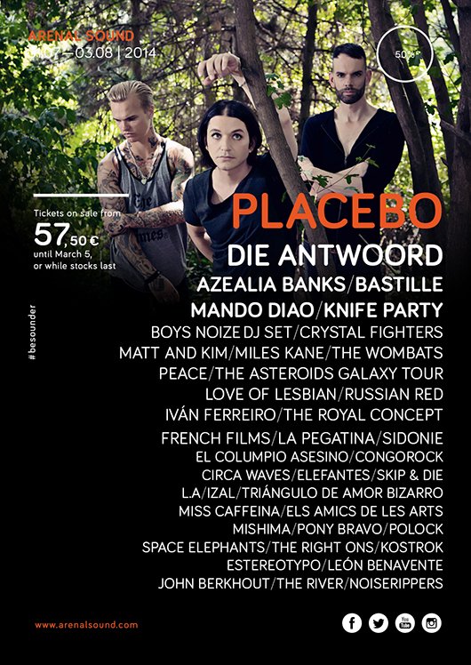 Hace pocos días os anunciábamos un curioso y apetecible cabeza de cartel para la próxima edición del Arenal Sound, los sudafricanos Die Antwoord. Hoy volvemos a actualizar las incorporaciones a su cartel con el trío británico Placebo, que vendrán a presentarnos su último disco Loud Like Love. El grupo liderado por el carismático Brian Molko, lleva años subido encima del escenario ofreciendo conciertos de lo más animados, donde no pueden faltar algunas de las canciones que les hicieron saltar a la fama como 'Every Me and Every You', 'Special K', 'Taste in Men', 'The Bitter End' o 'Meds'.