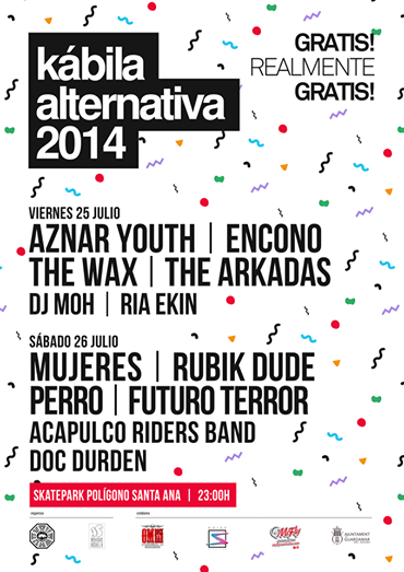 Este fin de semana, durante los días 25 y 26 de julio en Guardamar del Segura (Alicante) tiene lugar una nueva edición del Kábila Alternativa. Un cartel que ha logrado aglutinar a actuales bandas de la escena más underground nacional para que la diversión y las energías estén por todo lo alto. Por el escenario instalado en el Skatepark del Polígono de Santa Ana, desfilarán bandas tan punkis como Aznar Youth, los acelerados y divertidos Perro, Futuro Terror presentando su futuro primer LP o nuestros admirados Mujeres para desatar la locura del personal y provocar grandes pogos. Por si no os habéis enterado, el evento es gratuito así que no os dolerá para nada el bolsillo. Acércate y déjate llevar por un finde de buena y alternativa música.