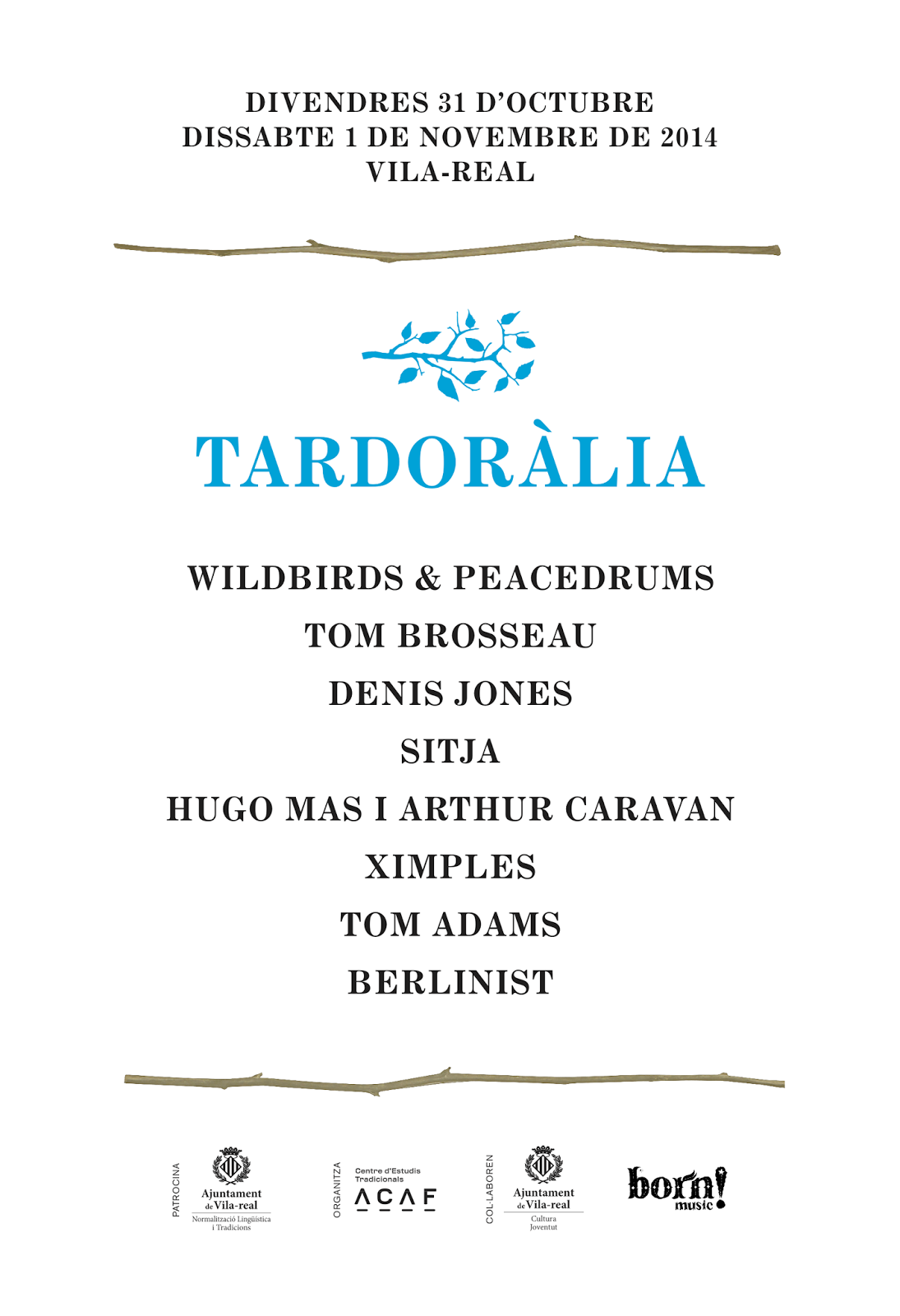Desde Born Music! nos llegan noticias de una nueva edición de Tardoràlia, la tercera concretamente. De nuevo el festival, que se celebrará 31 de octubre y 1 de noviembre en la localidad castellonense, contará con grandes nombres ocultos, de esos que siempre apetece escuchar con detenimiento. Estamos hablando de gente tan interesante como el jovencísimo británico Tom Adams, que nos acercará los placenteros sonidos de su primera referencia In The Constant Noise, un disco en el que incorpora una fuerte carga ambiental a unas canciones de cantautor que ya brillan de por sí. Tampoco podemos dejar pasar la ocasión de introduciros a los suecos Wildbirds & Peacedrums, un dúo sorpresivo con una trayectoria más que importante y que este año ha facturado Rhytm, un trabajo revolucionario en el que fusionan ritmos tribales con R&B y el inevitable carácter del pop nórdico.