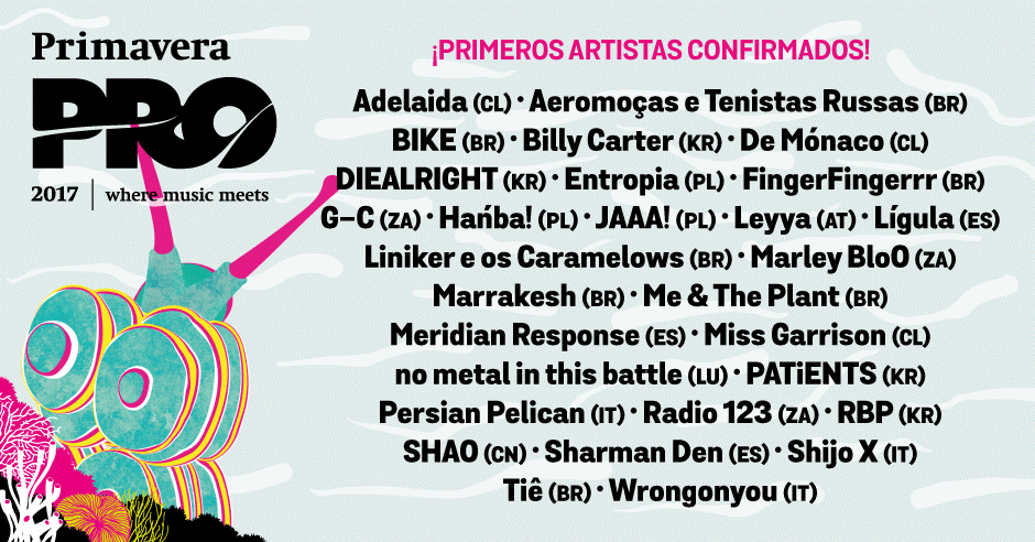 Hace unos días la organización desveló los primeros 29 grupos que conforman parte del cartel, encontrándonos propuestas de lo más variadas y exóticas. De este modo, presentarán sus propuestas a través de showcases y directos en el propio festival artistas como los brasileños Aeromoças e Tenistas Russas, el carácter pop brillante de Me & The Plant o el post-punk de los coreanos Diealright. Un gran compendio de artistas que seguirá creciendo para reforzar de lleno las líneas del cartel del Primavera Sound. Os dejamos con la lista de artistas confirmados hasta el momento.