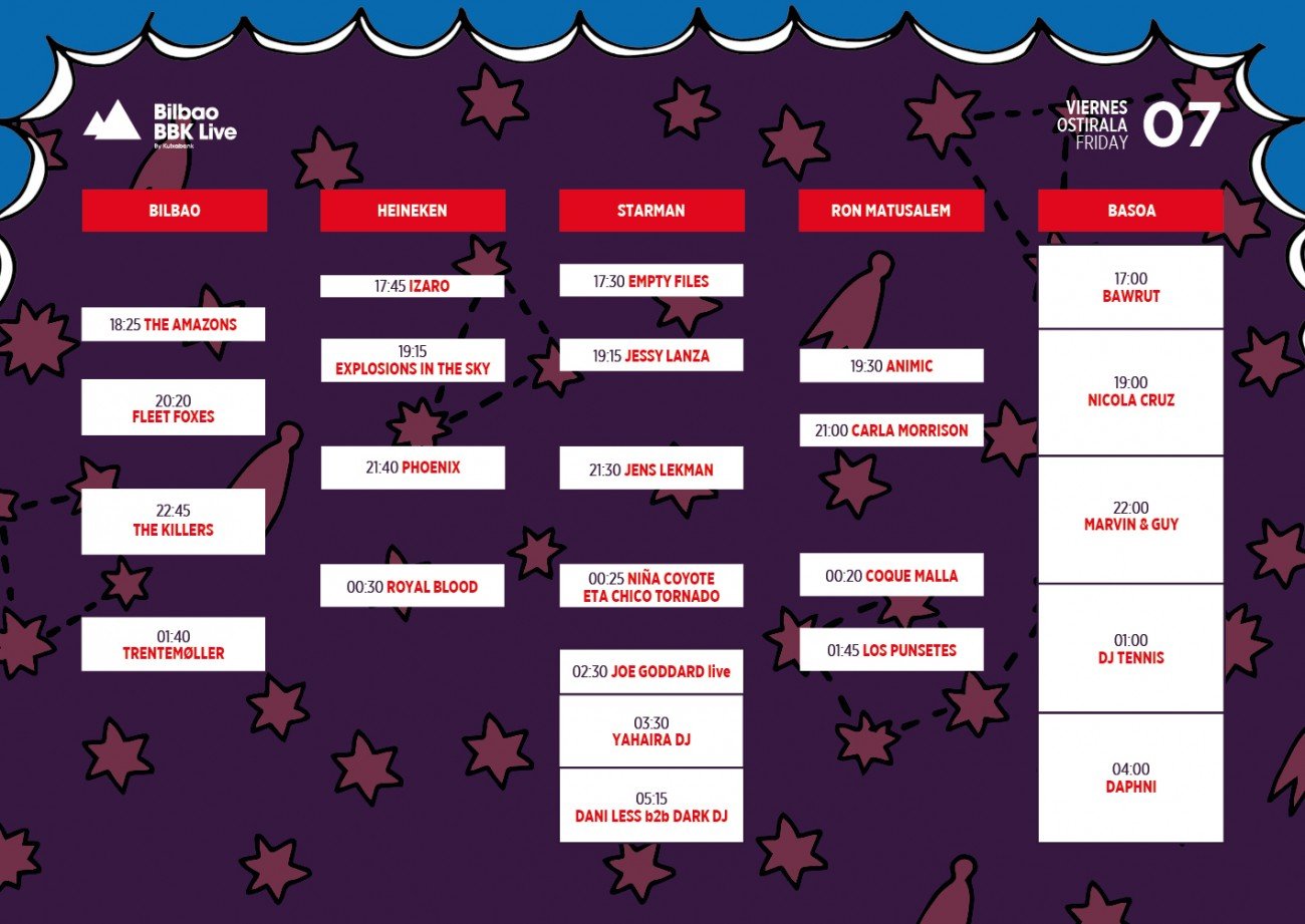 A falta aproximada de tres semanas para la celebración de una nueva edición del BBK Live, la organización del festival bilbaíno ya tiene listos los horarios de sus actuaciones, encontrándonos como viene a ser lógico en este tipo de eventos alguna que otra solapación de lo más dolorosa. ¿Spoon o The Avalanches? ¿Primal Scream o The Lemon Twigs? ¿Jens Lekman o Phoenix? Estas son parte de las dificultades que nos encontraremos a la hora de confeccionar nuestra ruta festivalera. Os dejamos con los horarios al completo y el link de venta de abonos.