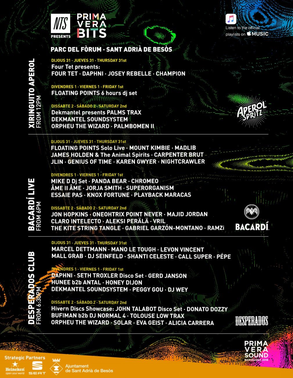 A pesar de que ya conocíamos al completo el cartel de la próxima edición del festival barcelonés, aún queda alguna sorpresa por conocer, como es el caso del Primavera Bits, el espacio destinado a todo lo que gira entorno a la música electrónica. En esta nueva edición, este espacio se ve incrementado con el Xiringuito Aperol, contando además con una programación diurna de primer nivel. En total tres serán los escenarios que albergará esta parte del recinto del Parc del Fòrum, desfilando por ellos a lo largo de las jornadas del jueves, viernes y sábado artistas de la talla de Superorganism, Pand Bear, Jon Hopkins, Floating Points, Oneohtrix Point Never o James Holden & The Spirit Animals. Una oferta de lo más variada que sirve para agrupar de una forma quizás más temática a bandas, DJs y productores. Os dejamos con el cartel completo de esta parte de la programación del Primavera Sound y su ubicación dentro del recinto.