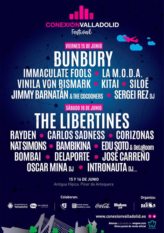 Con el cartel ya cerrado, la organización del festival vallisoletano acaba de hacer pública la distribución de artistas por días. Encontrándonos con que Bunbury encabezará la jornada del viernes en el festival, mientras que los británicos The Libertines serán los encargados de hacer propio el sábado. El reparto que podéis encontrar a continuación, se muestra de lo más equitativo confirmando lo ecléctico de un cartel que apunta tanto a un público juvenil como es el propio de artistas como La M.O.D.A. o Carlos Sadness, sin olvidarnos tampoco del poder de convocatoria de Bunbury y por supuesto el tirón internacional de The Libertines. Tampoco podemos dejar pasar por alto otras bandas que sirven de complemento perfecto, en un momento de carrera emergente como es el caso de Nat Simons o Delaporte. Os dejamos con la distribución al completo y el link de venta de entradas, también disponibles las de día a parte de los abonos.