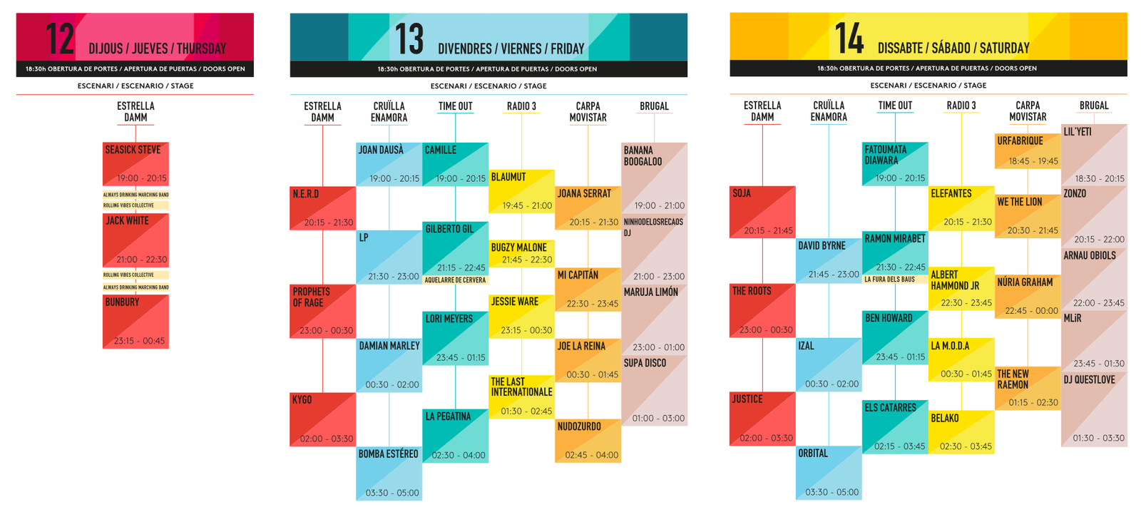 El festival barcelonés ha dado a conocer hoy los horarios de una edición que se avecina de lo más excitante con nombres de la talla de Albert Hammond Jr., Jack White, Justice o The Roots. Resulta increíble cómo año tras año la organización logra reunir en el Parc del Fòrum un conjunto de artistas estilísticamente distantes, pero que en conjunto acaban configurando uno de esos carteles en los que prácticamente lo quieres ver todo. Pues bien, ahora ya puedes hacer tus planes consultando los horarios disponibles, teniendo en cuenta que este año el festival comenzará el jueves en vez del viernes, dado que Jack White ofrecerá ese día uno de los conciertos más esperados del fin de semana. Os dejamos con los horarios de los tres días y el link de venta de abonos.