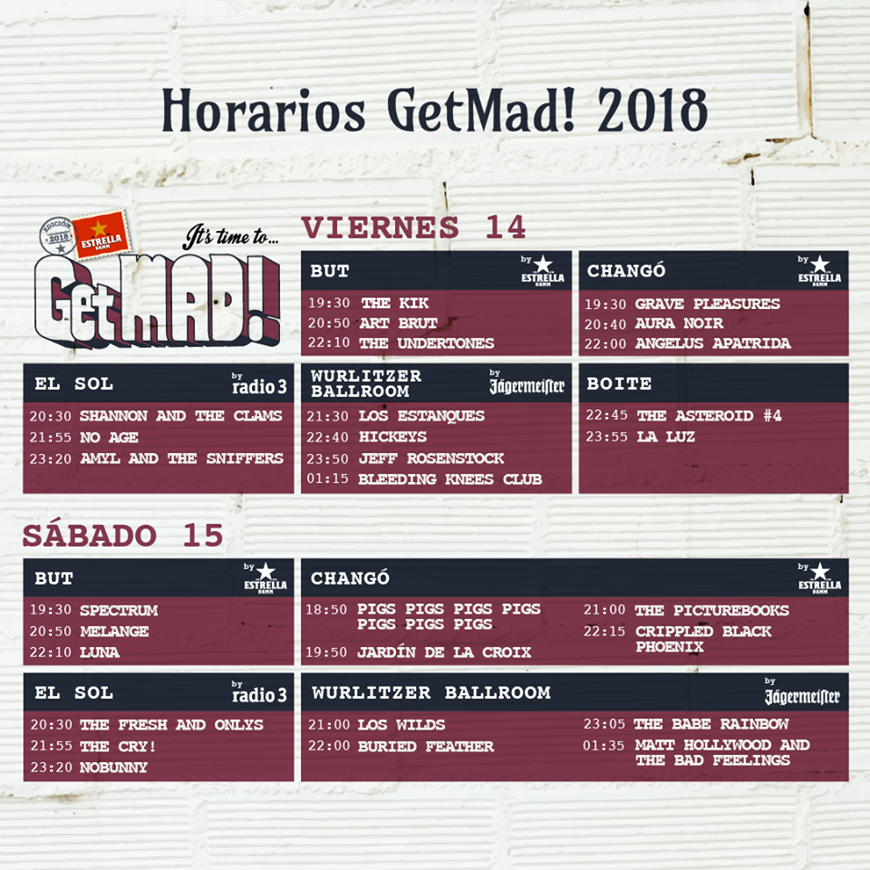 El GetMad! ya tiene todo listo para celebrar la que seguramente sea la mejor edición de su historia. Su cartel no es para menos con el elenco de nombres reunidos, pasando desde los legendarios Luna hasta las melodías más ruidosas de No Age. Por el camino, el abanico de artistas resulta también de lo más variado, teniendo cabida desde el apartado más garagero llevado hacia el soul brillante de Shannon and the Clams o ese apartado sombrío tan especial en el que se mueven Fresh and Onlys. Variedad y calidad por los cuatro costados para poner de manifiesto aquello de que las bandas de guitarras no están muertas ni mucho menos. A poco menos de tres semanas para su celebración, la organización ha desvelado los horarios de todas las actuaciones, incorporando además al cartel a unos The Kik que demostrarán la buena forma en la que se encuentran.