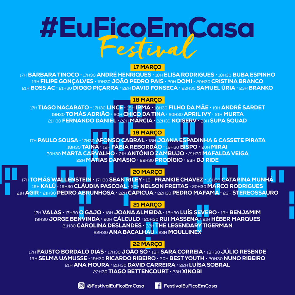 De forma similar a otras iniciativas como el Cuarentena Fest, desde Portugal también se han propuesto animarnos estos días con propuestas musicales en directo desde la intimidad de sus hogares. De esta forma a partir de hoy y hasta el próximo 22 de marzo, nuestras tardes serán más llevaderas conectando con los hogares de artistas como Noiserv, Samuel Úria, Best Youth o Lince. Con casi seis horas de directos diarias, resulta una buena ocasión para ponerse al día con proyectos de lo más pujantes a lo largo de todo Portugal, sintiendo muy de cerca como esta cuarentena también va a servir para conocer nuevas bandas y encontrar nuevas formas de disfrutar de la música en directo. Os dejamos con los horarios al completo siendo conscientes de que ya nos hemos puesto alguna que otra alarma para no perdernos los directos de Luís Severo, Benjamin o Capicua.