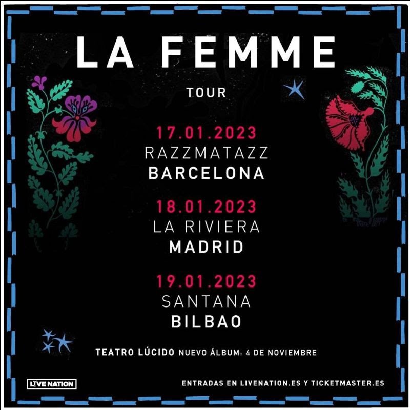 Los fans de La Femme en España están de enhorabuena, ya que la banda francesa acaba de anunciar su próxima gira por el país. La gira, titulada "Teatro Lúcido Tour", presentará el nuevo disco de La Femme del mismo nombre y tendrá lugar en algunas de las ciudades más importantes de España, como Barcelona, Madrid y Bilbao. Sus seguidores podrán disfrutar de las canciones más populares de La Femme y de las nuevas canciones de su más reciente e íntegro disco en castellano. Si eres fan de La Femme y no quieres perderte esta gira, asegúrate de comprar tus entradas lo antes posible. La banda es conocida por sus conciertos electrizantes y por su capacidad para conectar con el público, por lo que esta gira promete ser un evento inolvidable. ¡No te la pierdas!
