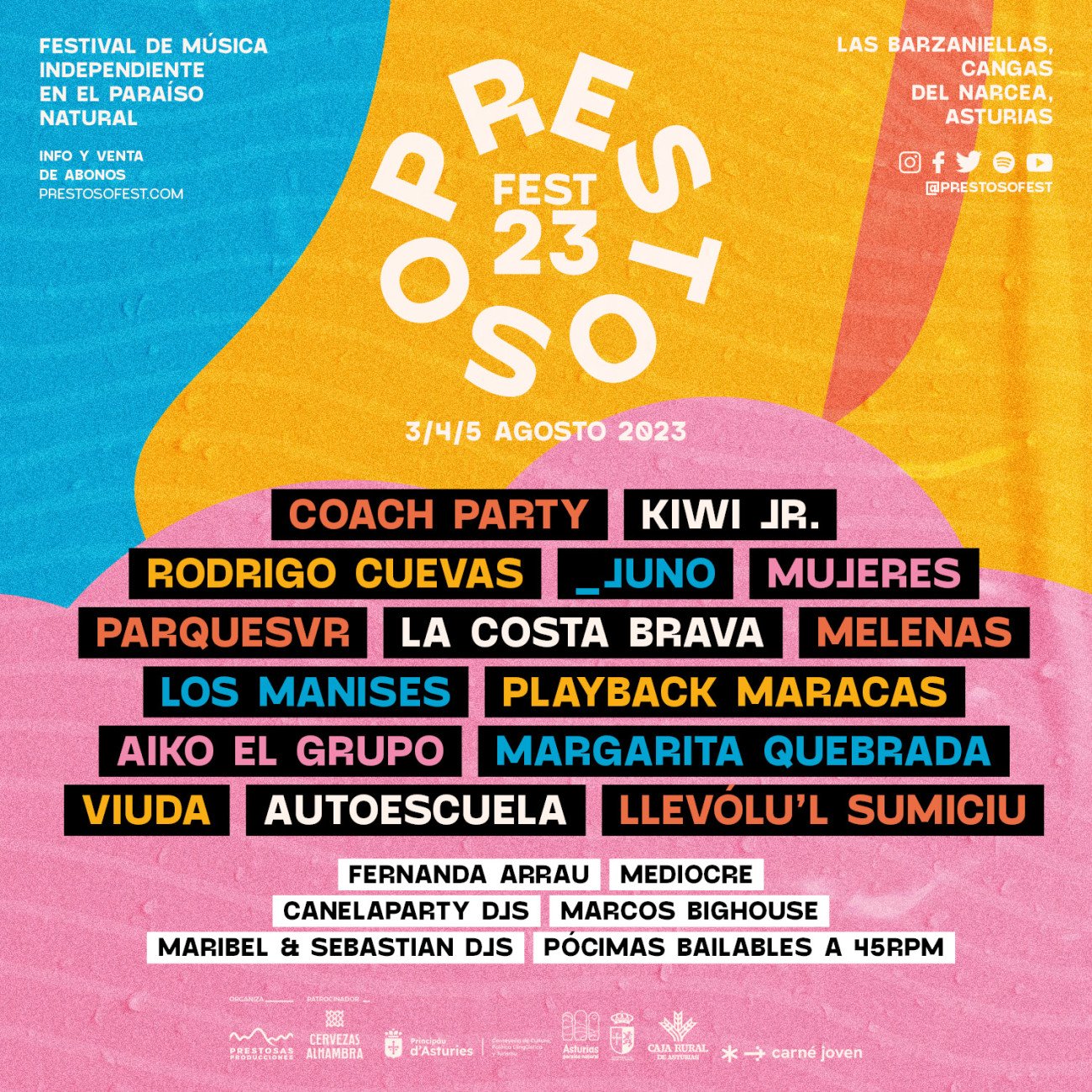 Esta mañana se ha desvelado al completo el cartel de una nueva edición del Presto Fest. El festival asturiano más emblemático que se muda a Las Barzaniellas de Cangas Del Narcea (a unos cuantos kilómetros de su antigua sede en Xedré) para seguir creciendo fiel a su filosofía de acercarnos bandas seleccionadas siempre con buen gusto. Buena muestra de ello es el cierre de cartel que nos han mostrado hoy, contando ni más ni menos que con Kiwi Jr., la formación canadiense de garage pop que se mueve como pez en el agua a través de narrativas repletas de anécdotas curiosas y sentimientos efusivos. Así lo atestiguan sus recientes trabajos Chooper y Cooler Returns, dos discos publicados con menos de un año de diferencia con los que poner de manifiesto su potencial a la hora de sonar lo más briosos posibles. También tirando de guitarras más que enérgicas llegarán los barceloneses Mujeres, quienes nos traerán nuevo disco bajo el brazo. Mirando más hacia casa, Autoescuela no faltarán a una cita en la que seguro que se encontrarán muchas caras conocidas entre el público, del mismo modo que los cántabros Aiko, El Grupo dejarán huella a base de sus ramalazos de punk pop. Os dejamos con el cartel al completo y el link de venta de abonos.