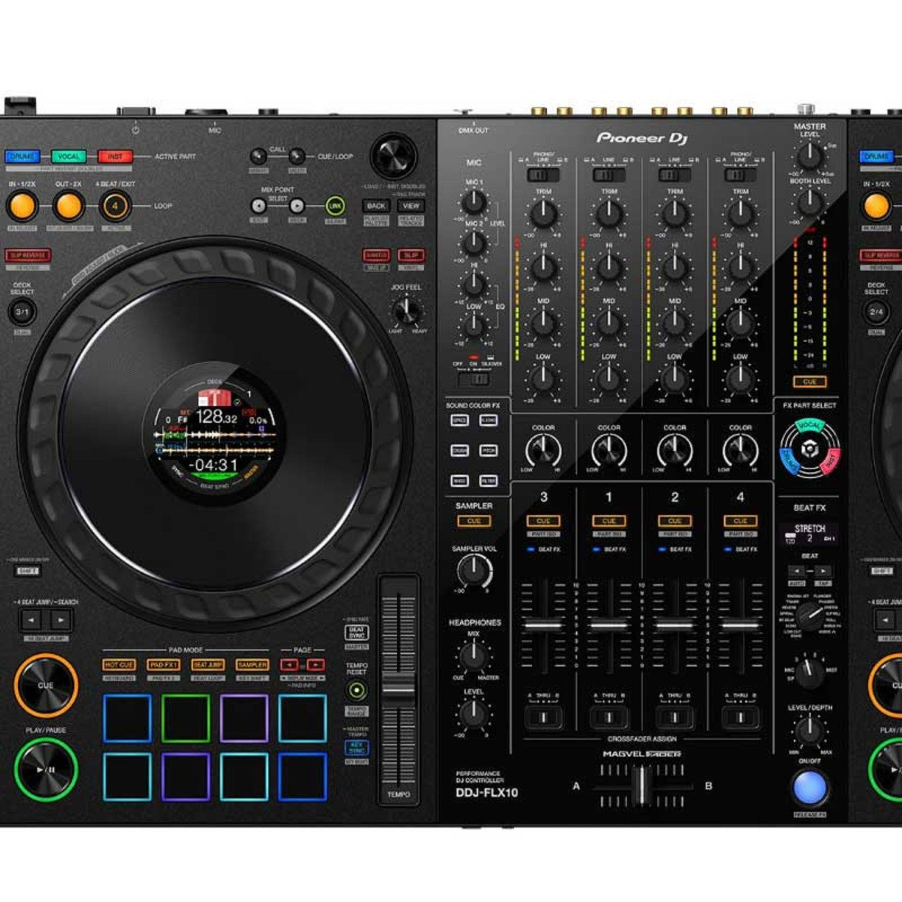 Divide. Mezcla. Crea: Pioneer DJ presenta el DDJ-FLX10 Controlador DJ de 4 canales para rekordbox y Serato DJ Pro con nuevas funciones para actuaciones innovadoras. Crea combinaciones en vivo, personaliza las pantallas de jog y utiliza la salida DMX para un fácil control de la iluminación Divide. Mezcla. Este controlador incluye una serie de características completamente nuevas que permiten nuevas posibilidades creativas, incluidas funciones que puedes usar para realizar mezclas sobre la marcha fácilmente, sin necesidad de preparar pistas con anticipación.
