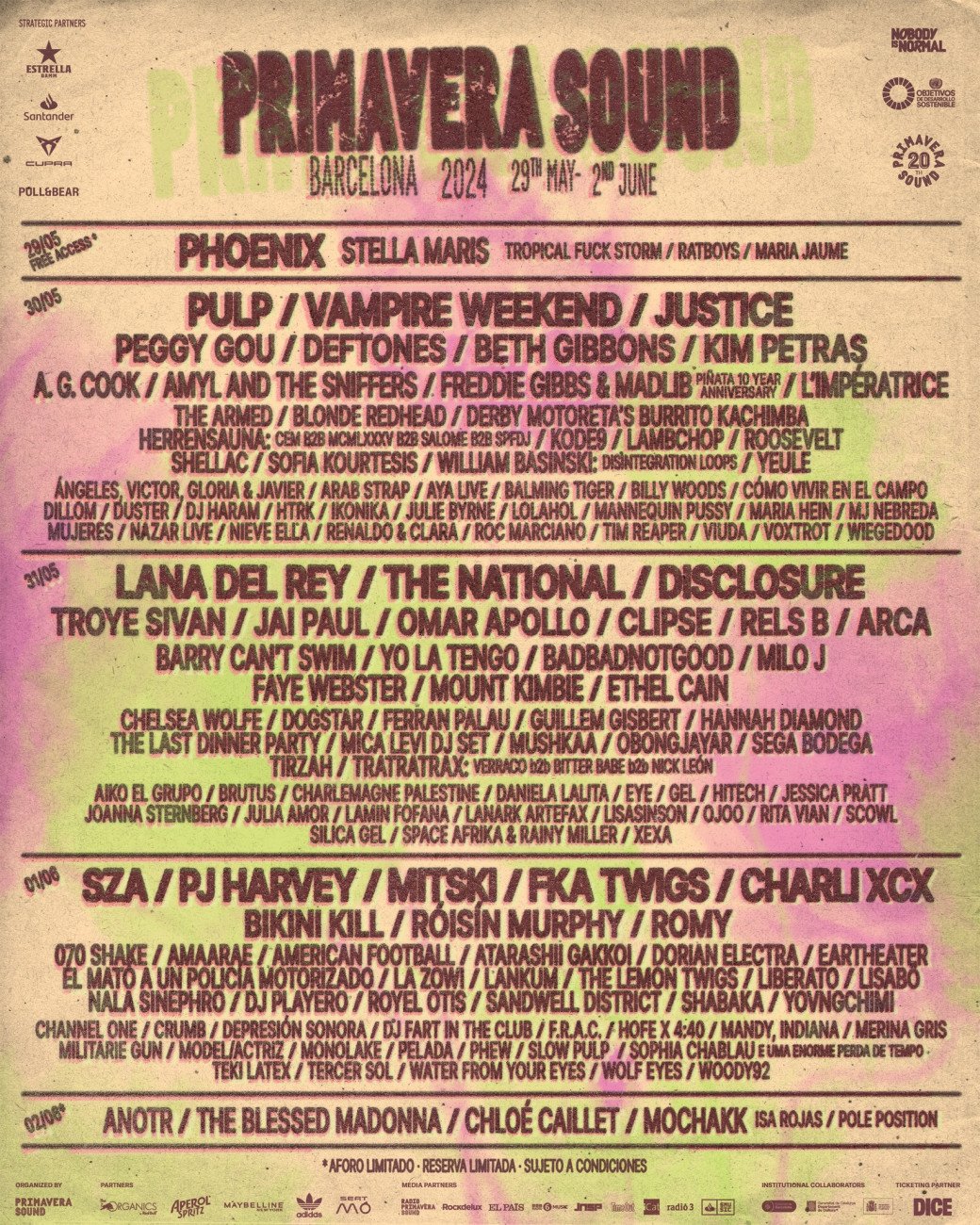 El festival Primavera Sound, que se celebrará en Barcelona del 30 de mayo al 1 de junio de 2024, ha desvelado los artistas que actuarán cada día. Los conciertos principales del primer día correrán a cargo de Pulp, Vampire Weekend y Justice, bien secundados por artistas imperdibles como Yeule o Julie Byrne. El plato fuerte del 31 estará protagonizado por Lana Del Rey junto a Faye Webster y Mount Kimbie. La última jornada contará con SZA, Mitski y FKA Twigs junto a la potencia de Bikini Kill y Roye Otis entre otros. El evento inaugural gratuito del 29 tendrá las actuaciones destacadas de Phoenix, Stella Maris y unos Ratboys que presentarán su nuevo disco The Window. Las entradas saldrán a la venta el martes 28 a las 11:00 horas a falta de conocer aún la programación del siempre entusiasmante Primavera a la Ciudad.