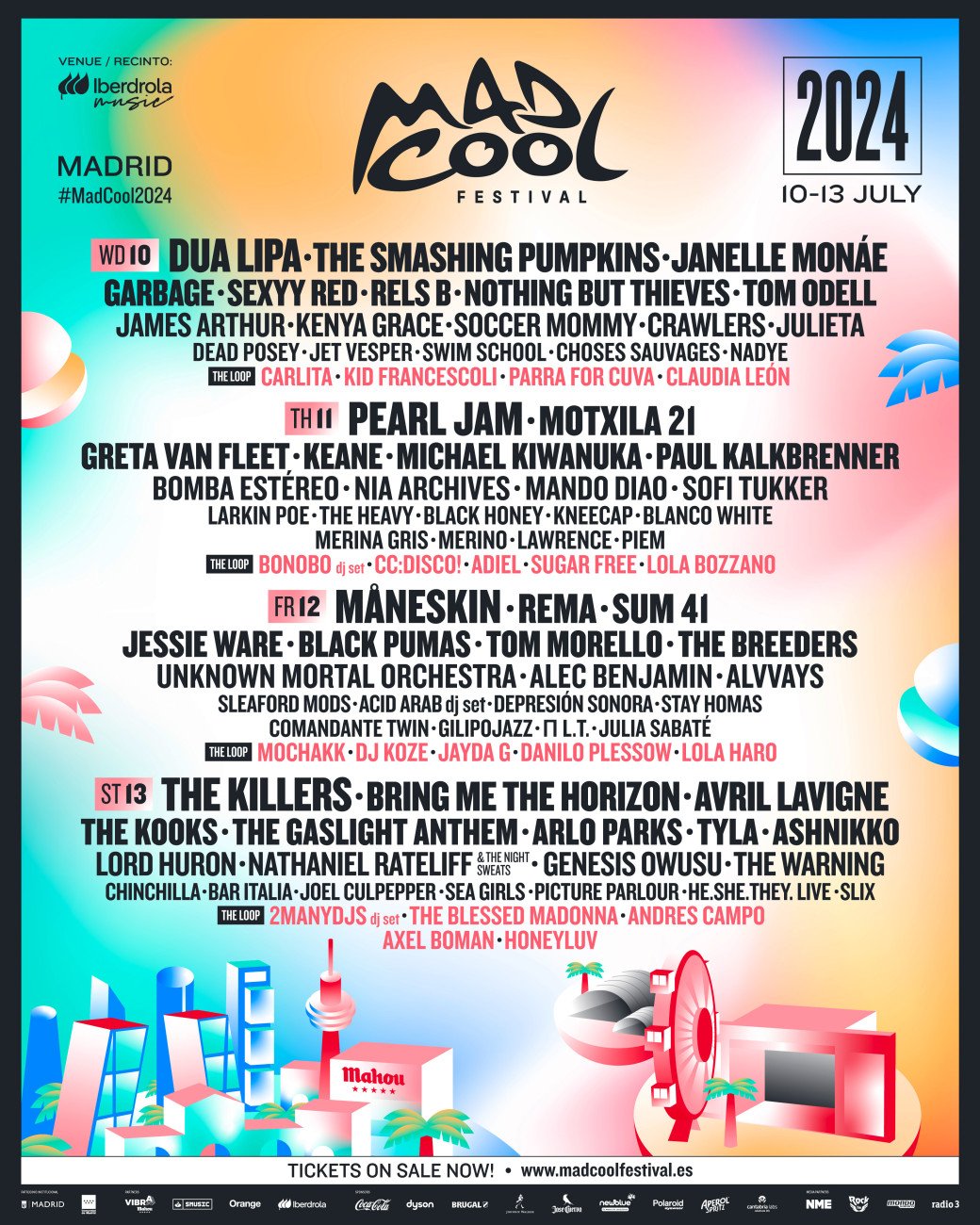El Mad Cool Festival 2024 ha cerrado su cartel con la incorporación de 21 nuevos artistas, entre los que destacan The Killers, Måneskin, Rema, Tyla, Alec Benjamin, Sexyy Red, 2ManyDJs dj set, Claudia León, Dead Posey, Nia Archives y Lord Huron. La cita musical contará con las actuaciones de grandes headliners como Pearl Jam, Dua Lipa, Avril Lavigne, Bring Me The Horizon y The Smashing Pumpkins. Tras escuchar las opiniones del público asistente a ediciones pasadas, la organización del festival ha implementado mejoras en la experiencia global, como la reducción del número de escenarios y del aforo general para mejorar los flujos y evitar solapamientos entre artistas. Además, se incrementarán los puntos de agua, baños, barras y zonas de descanso. El evento busca seguir posicionando a Madrid como referente de la cultura musical internacional.