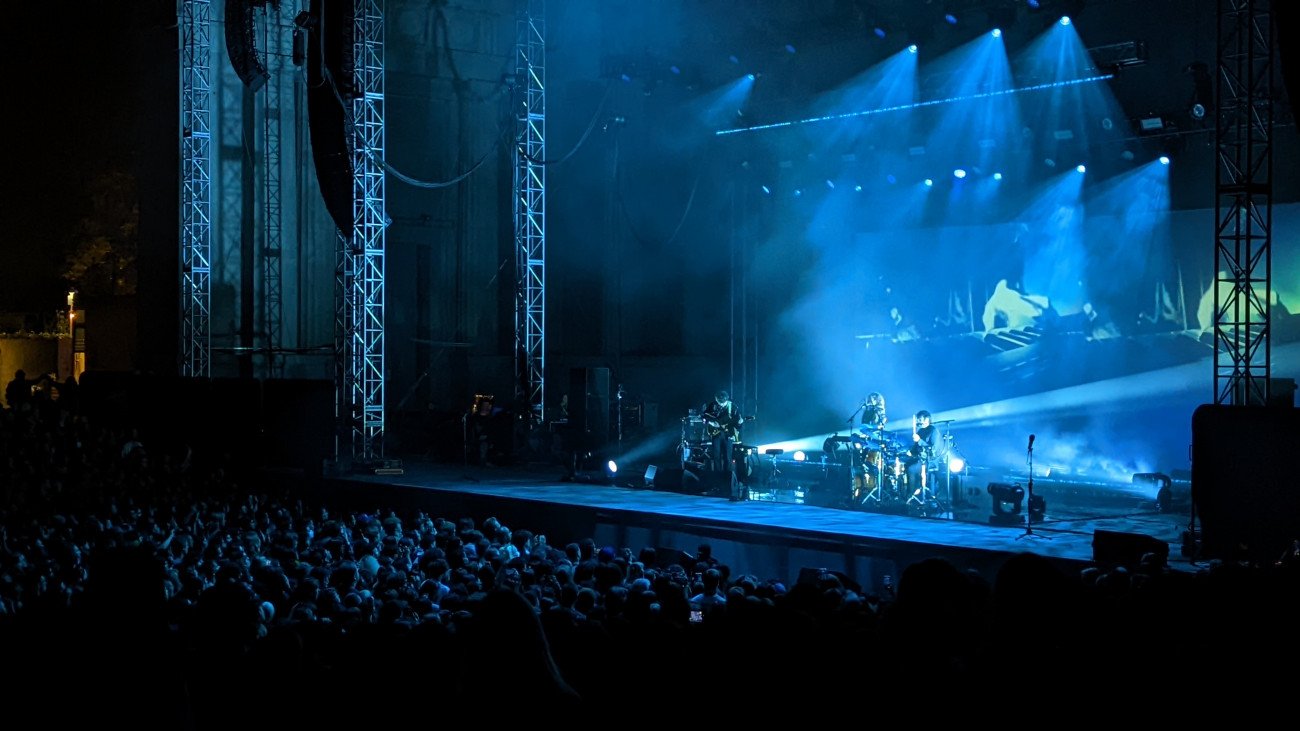 Poco después y bajo un cielo azul marino profundo salpicado de estrellas, Beach House hacen su entrada en un escenario de lo más minimalista, con tan solo los instrumentos necesarios y una gran pantalla a sus espaldas para resaltar sus siluetas. Victoria Legrand y Alex Scally, acompañados por el batería James Barone consiguieron que el bullicio del gentío quedara en silencio expectantes para arrancar con un repentino aplauso que dio la bienvenida a los de Baltimore. Comenzaron el concierto con ‘Once Twice Melody’, y a partir de allí entrelazaron tema tras tema con gran delicadeza y soberanía, consiguiendo que todos los asistentes nos sintiéramos hipnotizados y a la vez ansiosos por descubrir qué pista vendría después. Siguieron ‘Silver Soul’, ‘Through Me’ y la aplaudidísima ‘Lazuli’, todas ellas interpretadas en una sombría atmósfera que nos impedía ver las caras de los artistas, escondidos detrás de una pantalla que ofrecía una variedad de imágenes y colores perfectamente sincronizados con la emoción de cada canción.