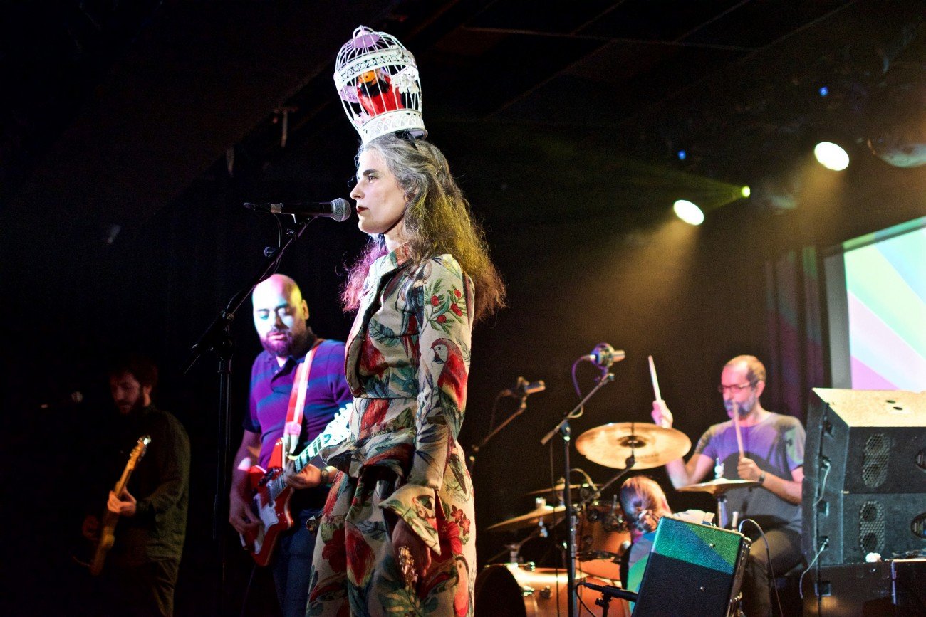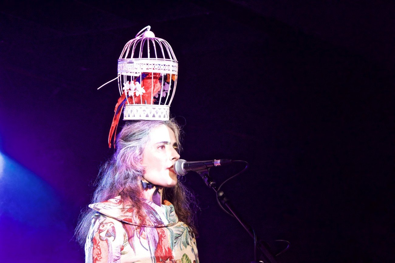 Precisamente, Ariadna, con su carisma –o no- habitual, aparecía en el escenario llevando un vestido estampado de loros y flores y coronando su cabeza con una jaula y un loro dentro. Hemos puesto en entredicho su capacidad de seducción sobre el escenario porque ese particular hieratismo escénico a modo de Kore griega más que sumar, resta puntos a su directo; aunque también he de decir que para quien escribe estas palabras es su primera incursión en su directo.