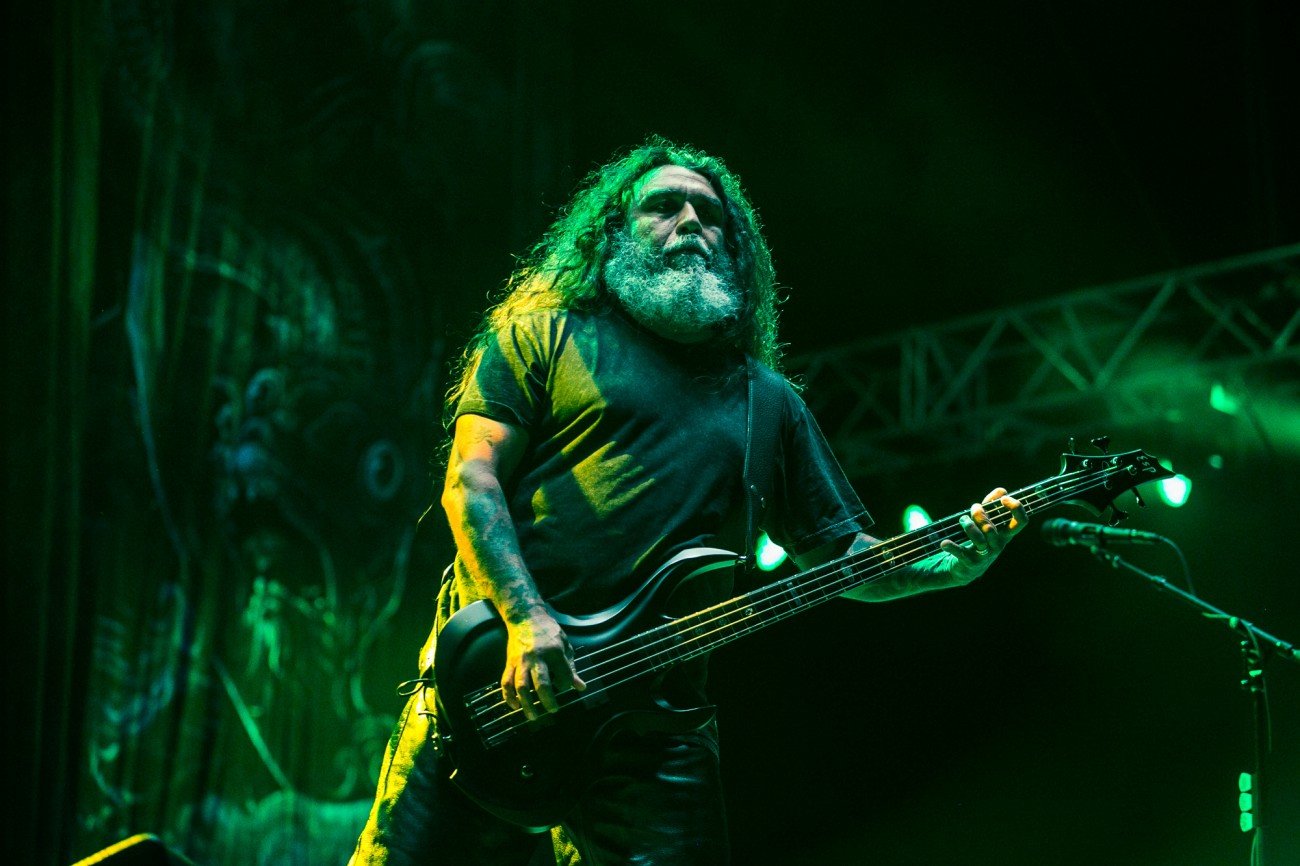 incluida en su último trabajo homónimo y dejaron clarito que es lo que nos íbamos a encontrar: doble bombo a piñón (Paul Bostaph), duelo de guitarras (Kerry King y Gary Holt) y la voz cavernosa del gran Tom Araya, quien se arrancó con un español macarrónico al público, producto de sus orígenes chilenos.