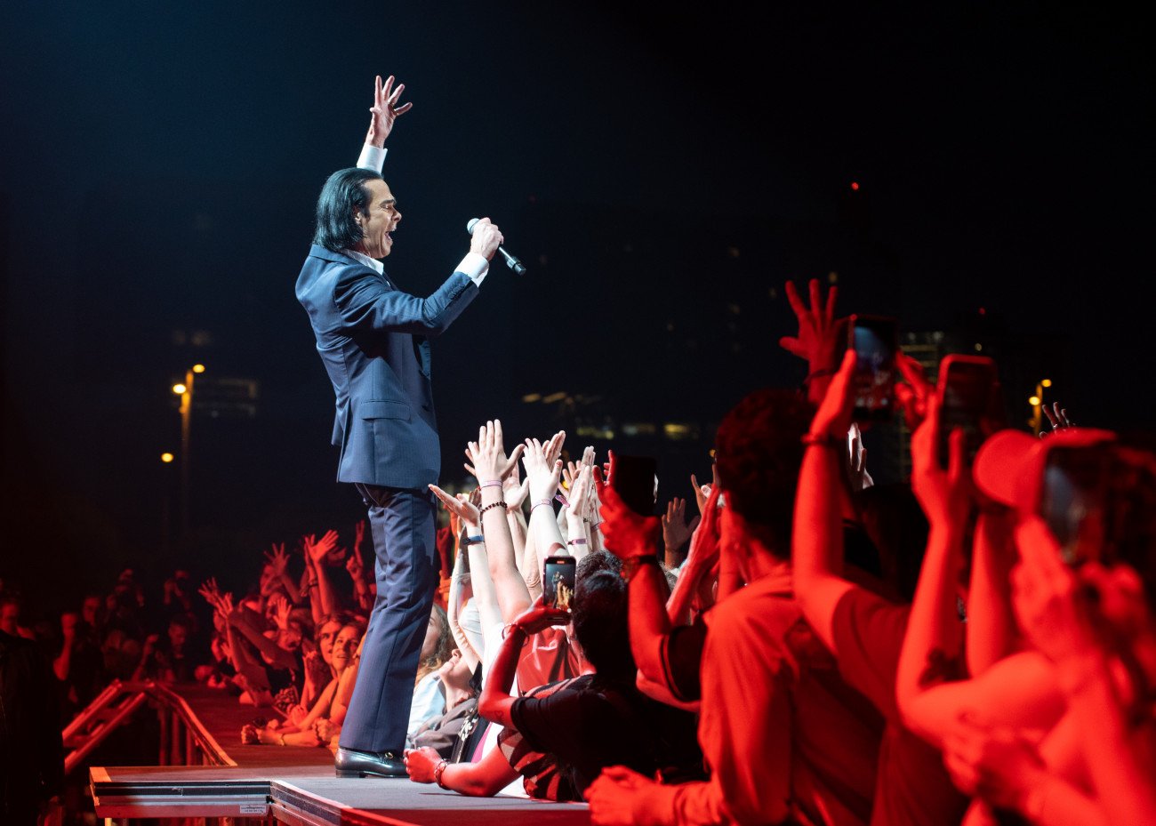 Este tramo denso acabó con “Tupelo”, momento en el australiano salió de la mortaja y con esputo y rabia se sacó un triplete de aúpa, aparte del ya mencionado, añadió “Red right hand” y “Mercy seat”. Muy aficionado a mezclarse con el público de las primeras filas y haciendo gala de su lado teatral y de divo que siempre acaba sacando, Cave repasó cada estrofa de sus labios en comunión con ese dintel de brazos en alto que, casi de forma mesiánica pugnaban por tocarle.