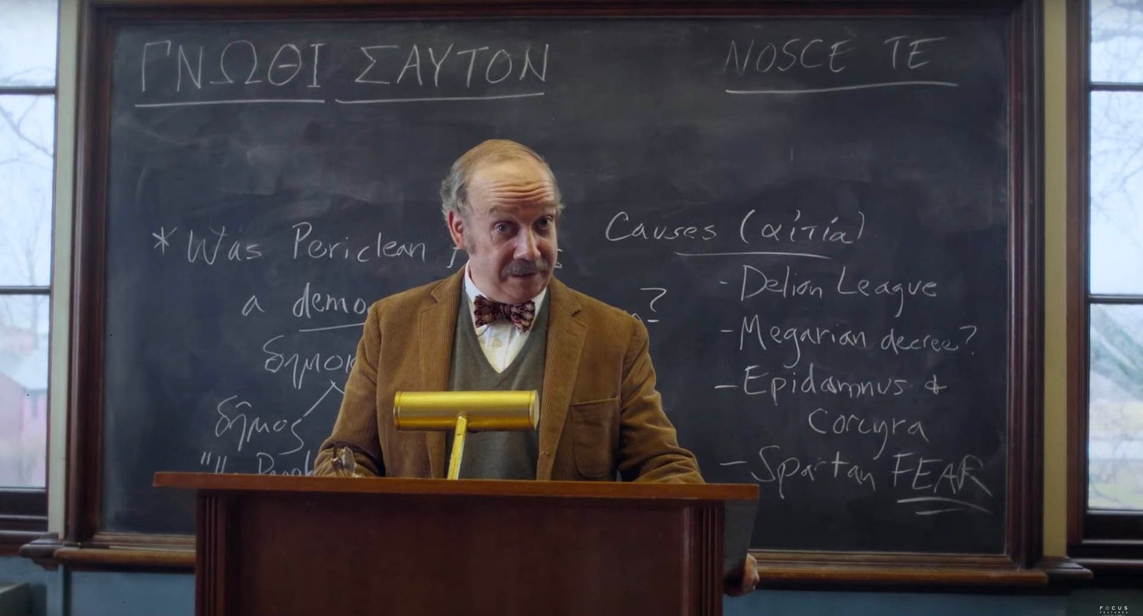 Paul Hunham no es un personaje precisamente entrañable. Cortante, petulante y más bien hosco, el profesor parece disfrutar haciendo la vida imposible a sus alumnos ricos y mimados con sus implacables calificaciones.
